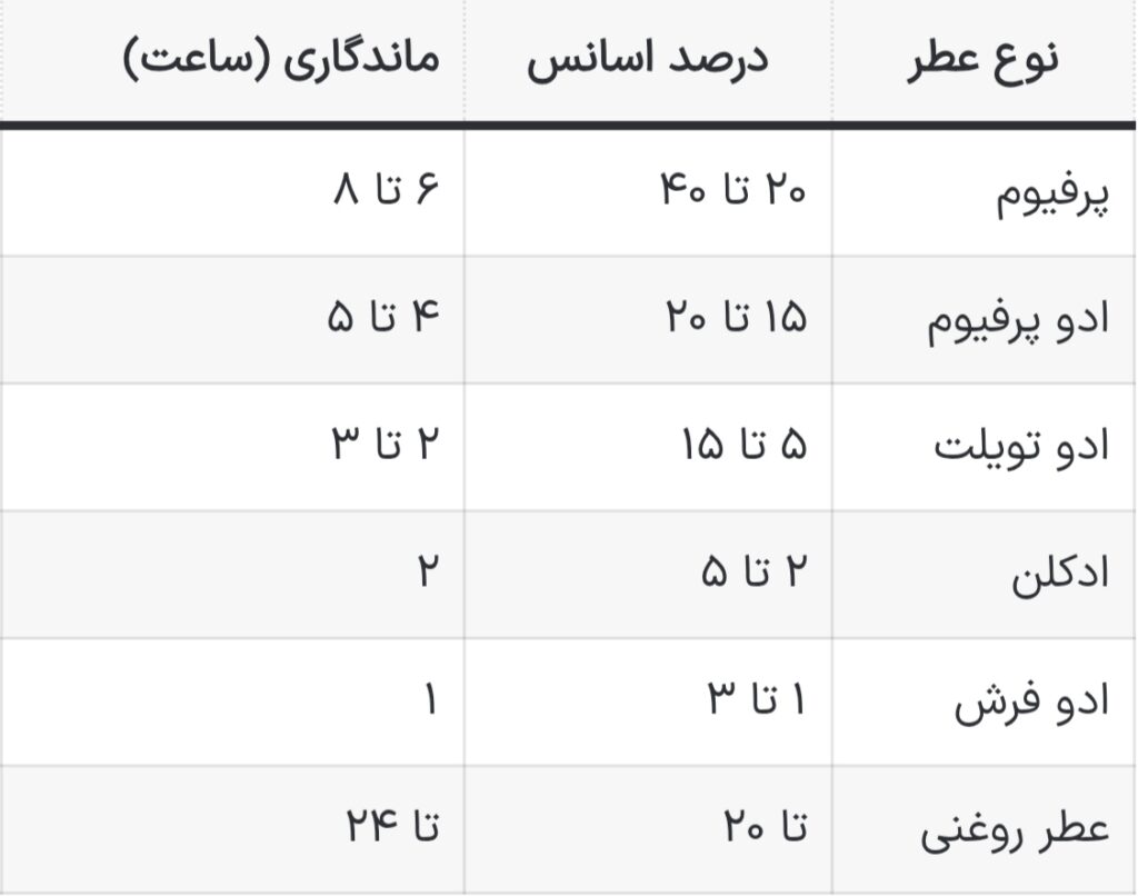 در نهایت داخل جدول زیر جمع بندی انواع عطر ها و درصد ماندگاریشون رو میتونید مشاهده کنید